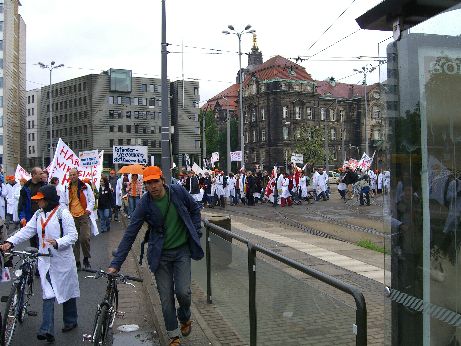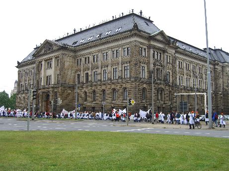 Auch am heutigen Mittwoch trafen wir uns 8 Uhr 30 vorm Haupteingang der MLU, um mit dem Bus nach Dresden zu fahren und die Protestaktion unserer Kollegen zu unterstützen. Nach 2 h Fahrt erreichten wir das Klinikum der Carl-Guastav-Universtät in Dresden. Dort trafen wir uns mit den Dresdenern sowie den Kollegen aus Jena, Leipzig und Magdeburg. Anschließend ging es (wie auch schon beim letzten Mal in Dresden) zu Fuß zum Finanzministerium (siehe Foto). Dort wurden die Forderungen der Ärzte noch mal vorgetragen. Es war reichlich Presse vor Ort. Danach marschierten wir in die Innenstadt (diesmal war die Route etwas länger, aber dafür strategisch günstiger gewählt). Auf dem Theaterplatz erfolgte dann die Abschlusskundgebung (hier gibt’s ein kleines Video zum Download), auch hierher hatten die Dresdener die Presse eingeladen. Für das leibliche Wohl der Streikenden war dank Würstchen- und Getränkestand gesorgt. Laut Presseberichten waren zwischen 450 und 500 Ärzte heute in Dresden dabei. Unser Bus aus Halle war etwa zur Hälfte besetzt, einige Kollegen kamen auch mit dem privaten Pkw. An dieser Stelle herzlichen Dank an den geduldigen Busfahrer und den guten Kaffee.