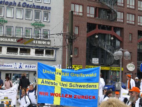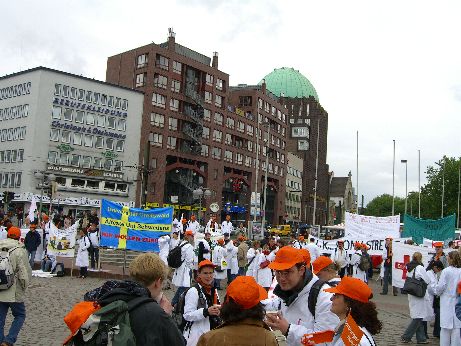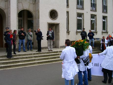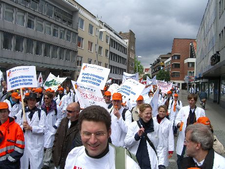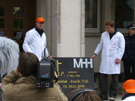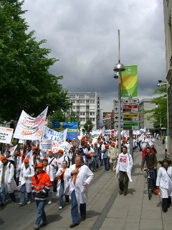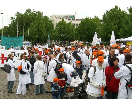 Heute haben wir uns 8 Uhr 30 vor dem Haupteingang der MLU Halle getroffen und sind mit dem Bus zur Medizinischen Hochschule nach Hannover gefahren, da die Hannoveraner um personelle Unterstützung gebeten hatten. Nach 3 Stunden Fahrt waren wir am Ziel. In Hannover am Steintor wurden wir von den Kollegen mit Erbsensuppe, Getränken und Live-Musik begrüßt. Auch aus den Unis Jena, Greifswald, Leipzig, Köln, Göttingen… waren Ärzte angereist. Die Stimmung war sehr gut und das Wetter weitaus besser, als es auf den Fotos den Anschein macht. Nach kurzer Stärkung marschierten wir dann los. Durch die Innenstadt ging es zur Staatskanzlei des niedersächsischen Ministerpräsidenten Christian Wulff (CDU). Dorthin trugen wir einen Grabstein, um zu verdeutlichen, dass unterer den jetzigen Bedingungen die Hochschulmedizin in Deutschland langfristig zu Grabe getragen wird. Auf den Stufen der Staatskanzlei wurden dann 2 Trauerkränze abgelegt. Leider ließ sich der Ministerpräsident nicht sehen. Dafür war reichlich Presse vor Ort. Weiterhin wurde in der Kundgebung TdL-Vorsitzenden Niedersachsens Finanzminister Hartmut Möllring (CDU) aufgefordert, an den Verhandlungstisch zurückzukehren. Laut Presseberichten nahmen etwa 800 Kollegen heute in Hannover teil. Leider war der Bus aus Halle mit nur ca. 20 Teilnehmern nur recht dürftig besetzt und es wäre schön, wenn bei den kommenden Aktionen, morgen Dresden, wieder mehr Kollegen mitkommen, um die Öffentlichkeit auf unsere Belange aufmerksam zu machen!