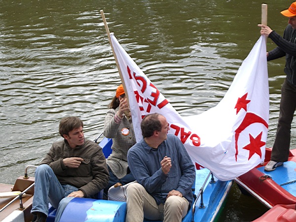 in Ruderboten, Tretboten und Motorboten mit ihren Transparenten bereit,